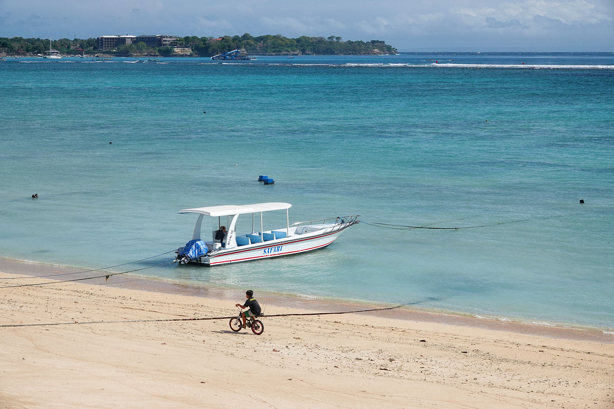 A speed boat used for snorkelling tours moored on Jungutbatu beach, Nusa Lembongan, as the tide goes out.