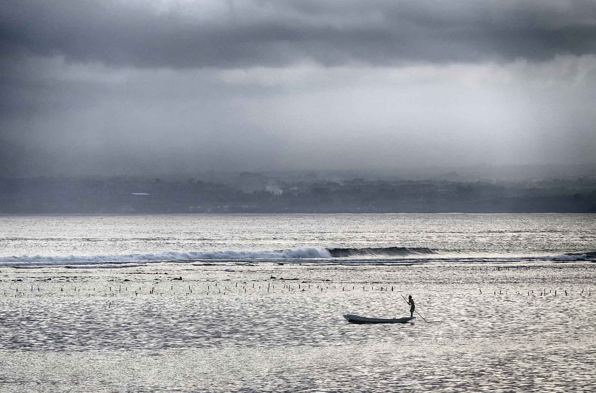 A cloudy, rainy and grey afternoon in Nusa Lembongan. The overcast extends past the local seaweed farmer and his plot, all the way towards and over the island of Bali.