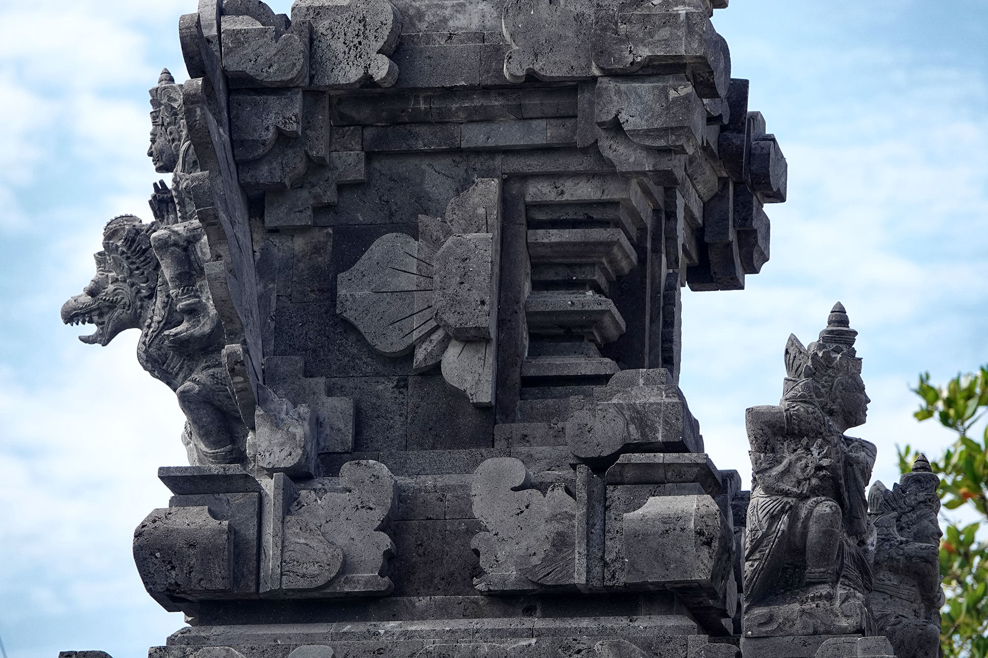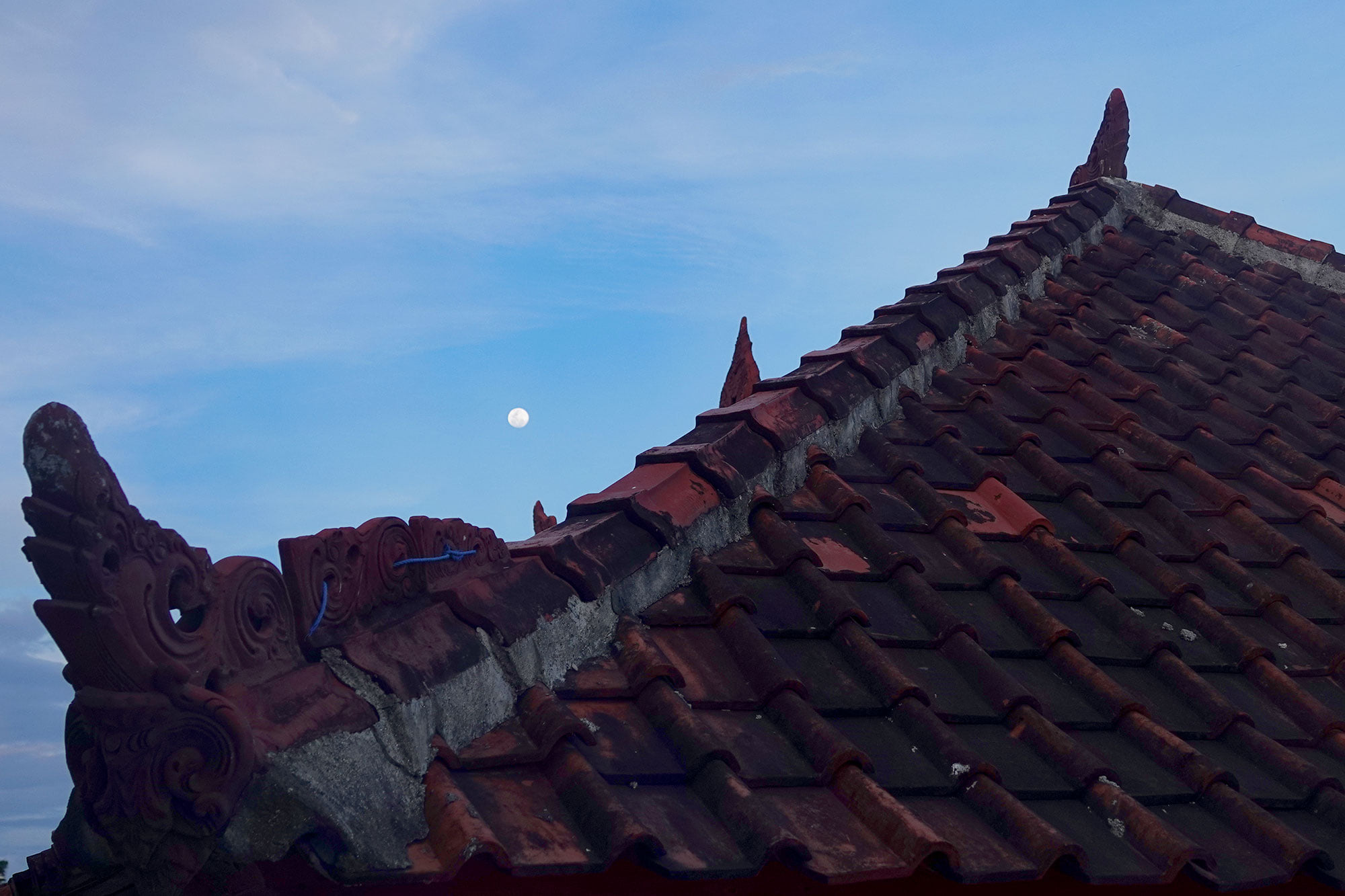 A closeup of a Balinese stone temple and a full moon rising over the roof of a traditional house during one afternoon.