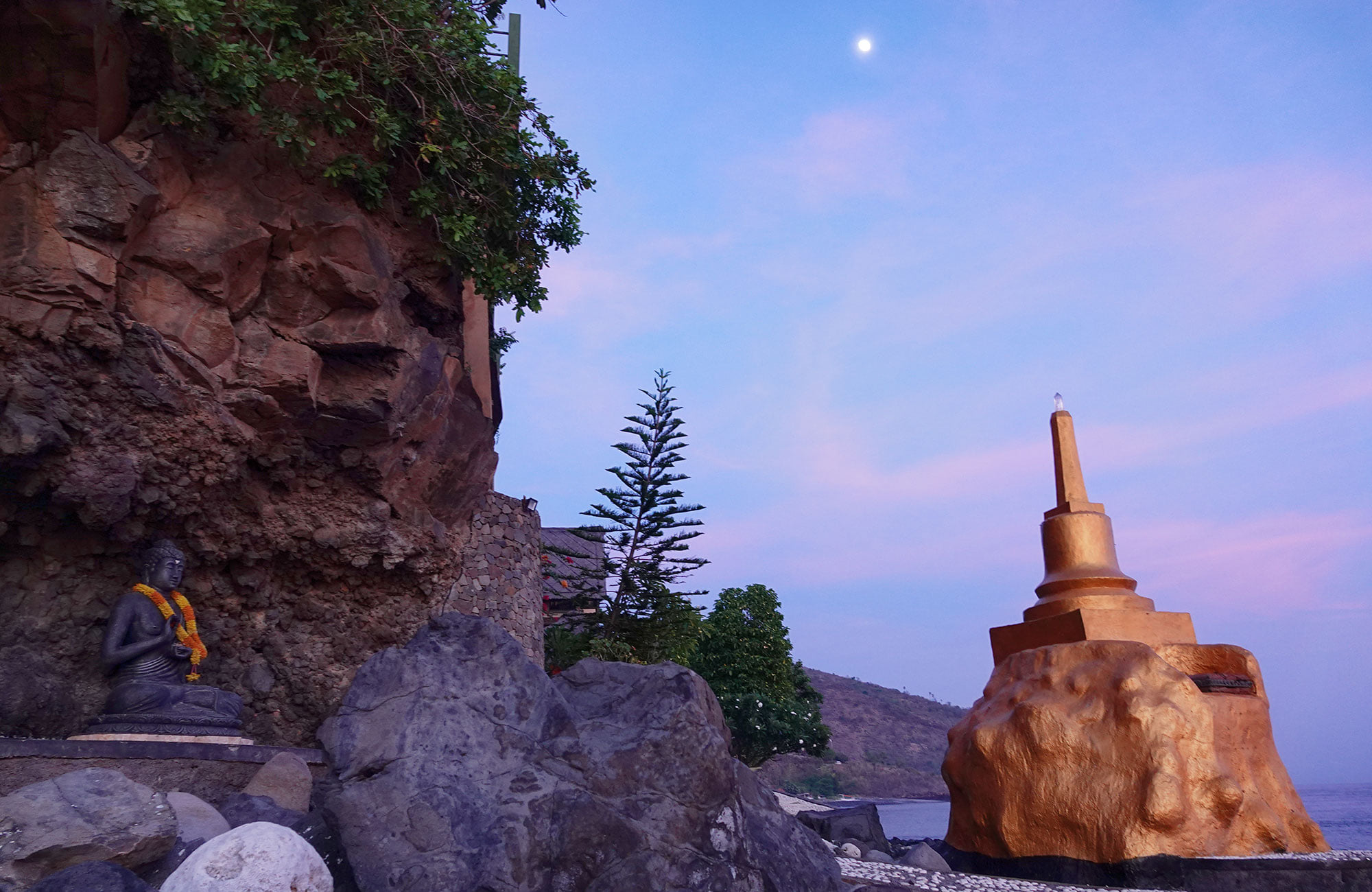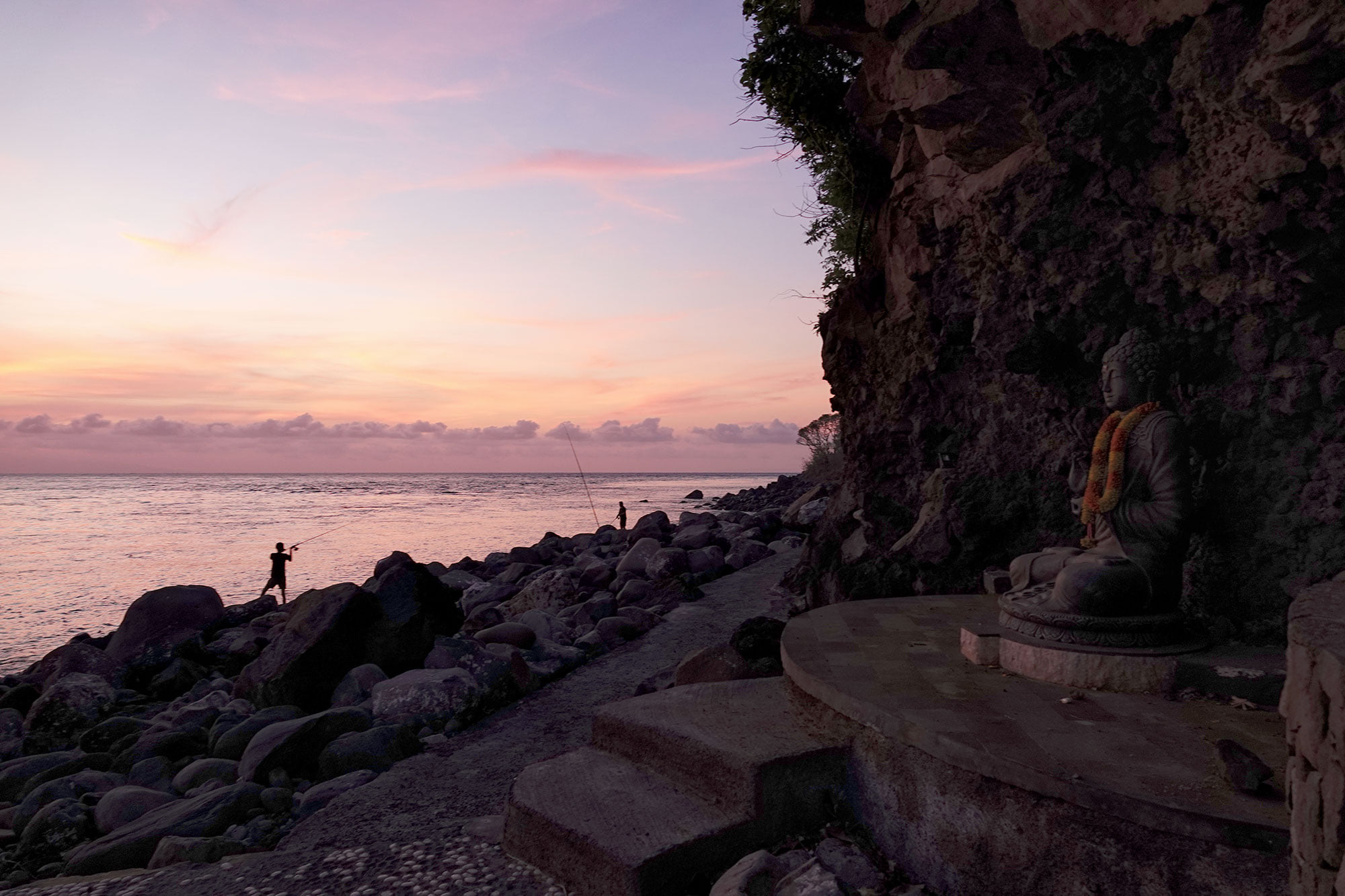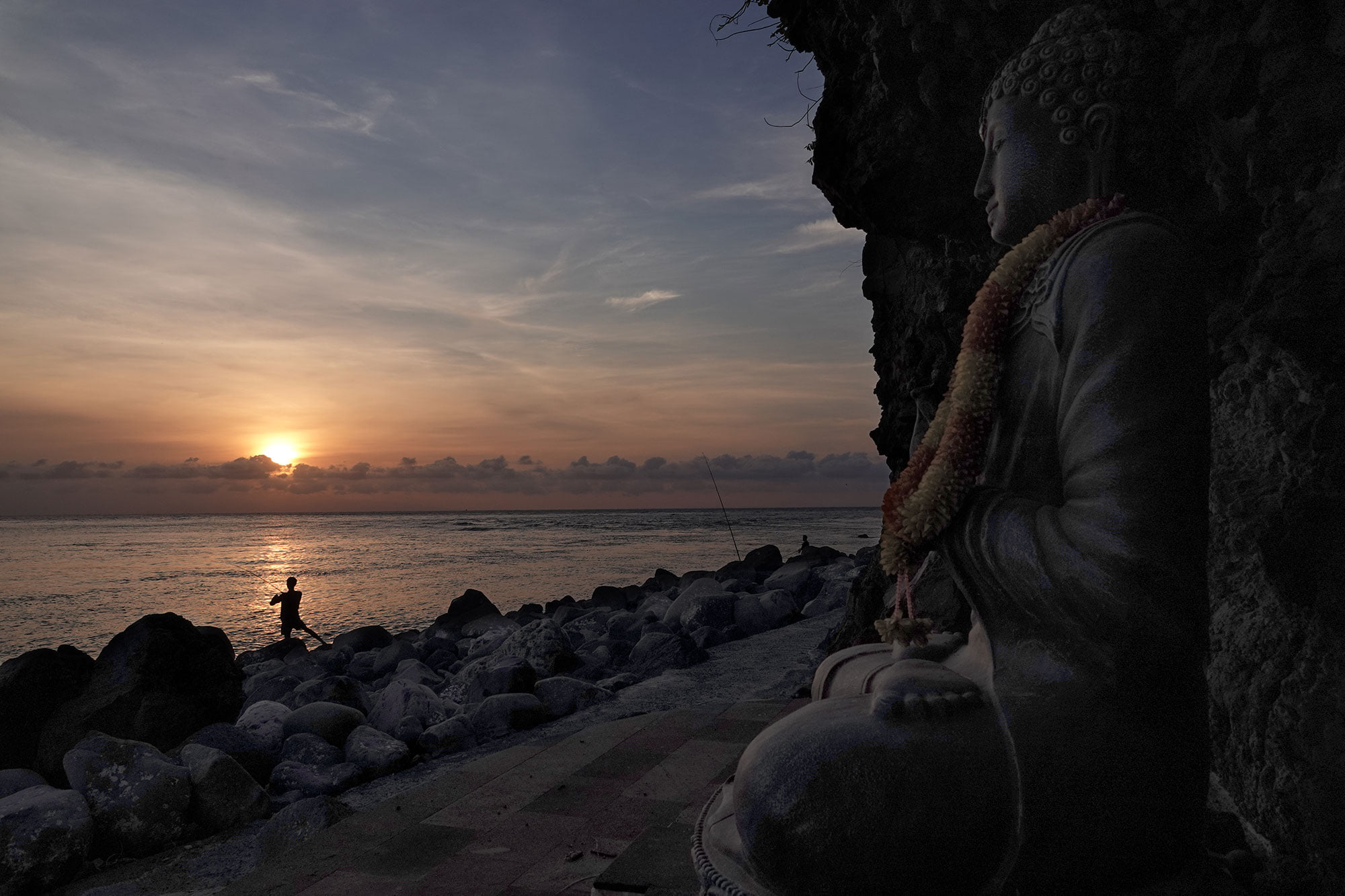 An alluring sunrise and its captivating colours sprayed across the sky one fine morning in East Bali. Buddha sculptures placed along the beach receive the energy of this first light, and appear glorious in their simple and yet intricate design.