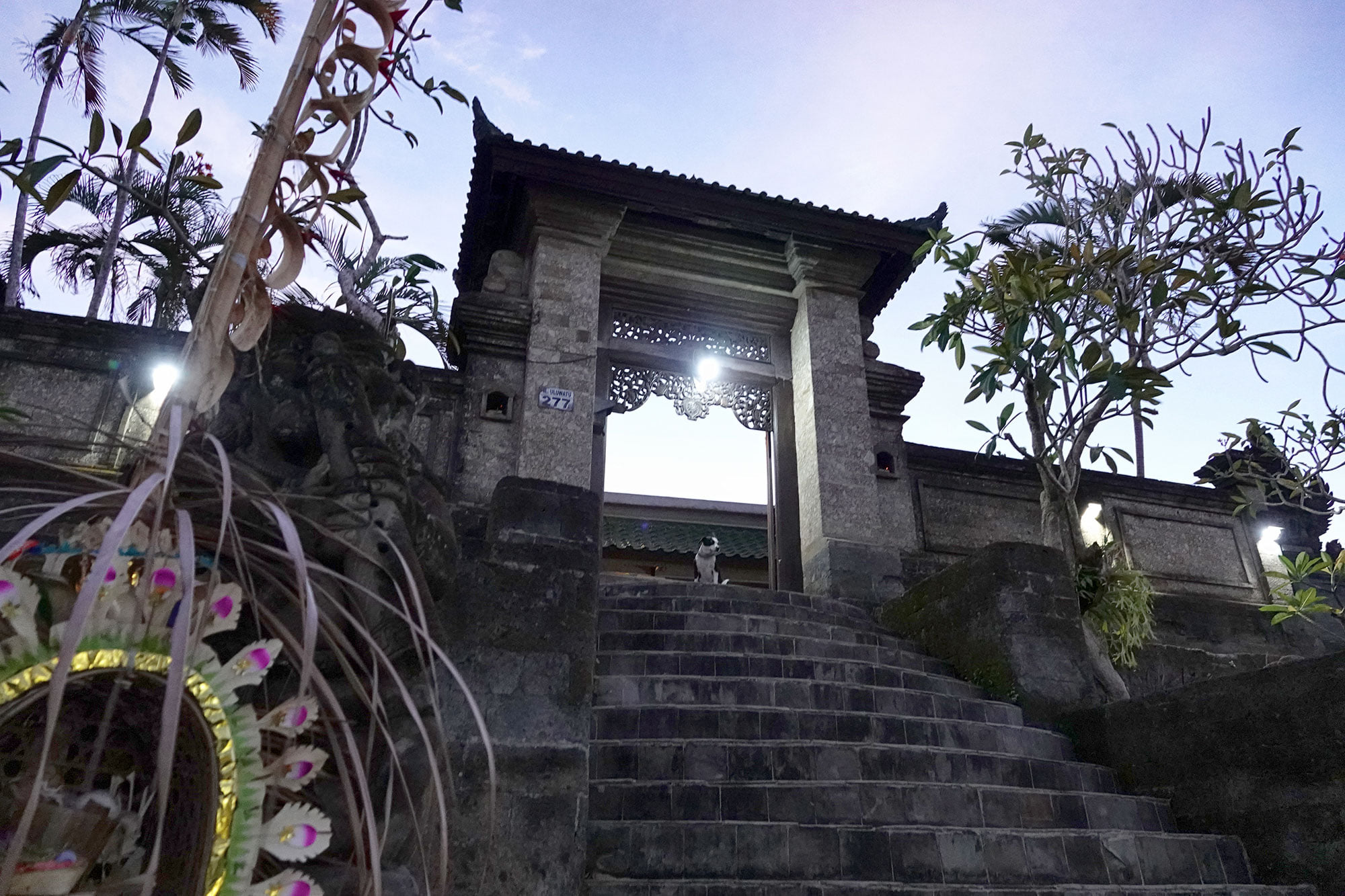 View of a traditional entrance to a Balinese home. This entrance is guarded by a Hindu statue as well as religious offerings.