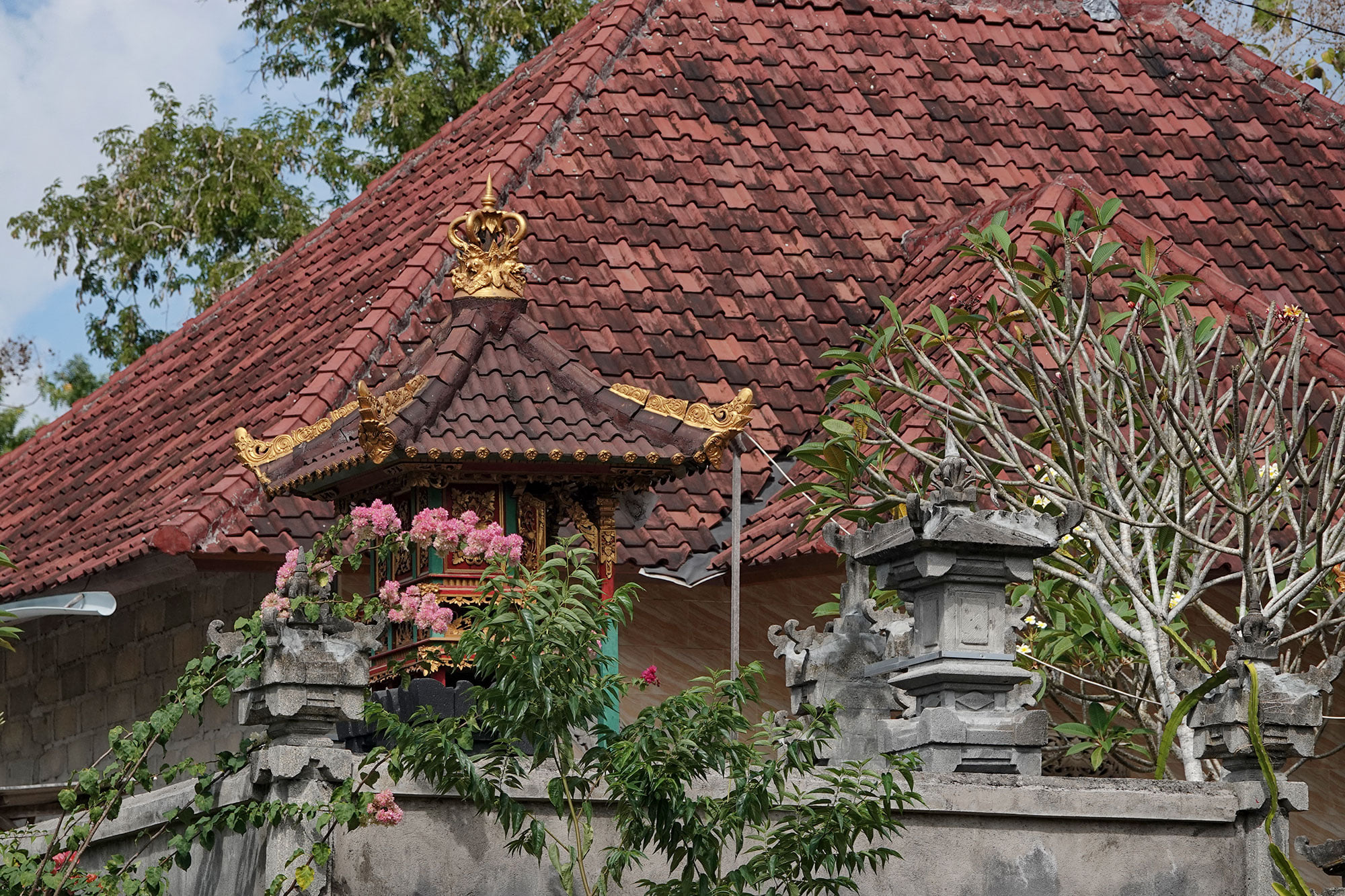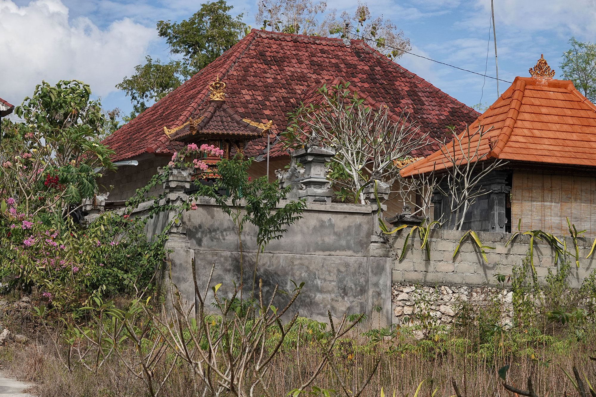The outside of a Balinese house and their family temple, surrounded by plants and wild flora.