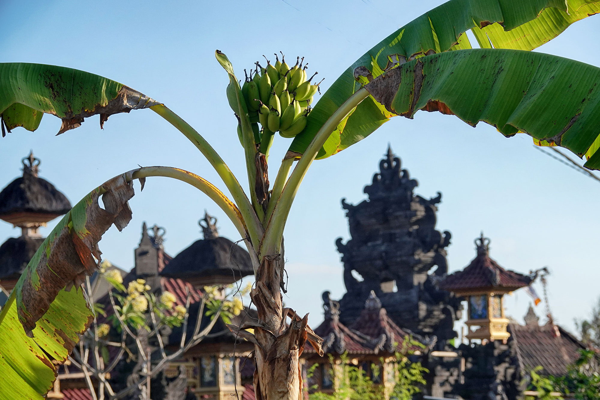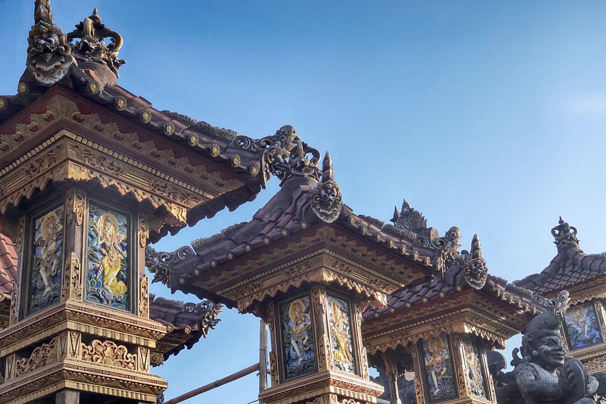A magnificent Balinese temple, glowing in all its glory in the afternoon light of the sun, on Nusa Lembongan.