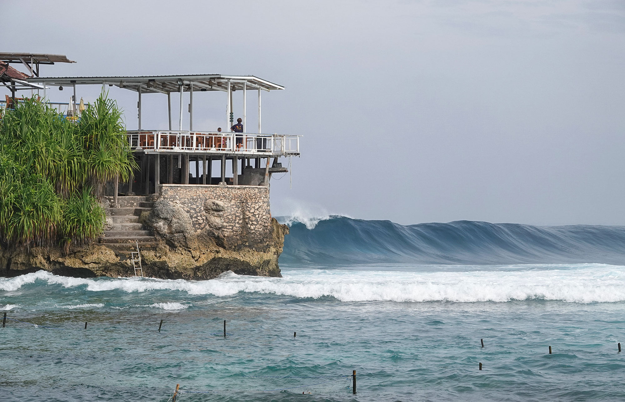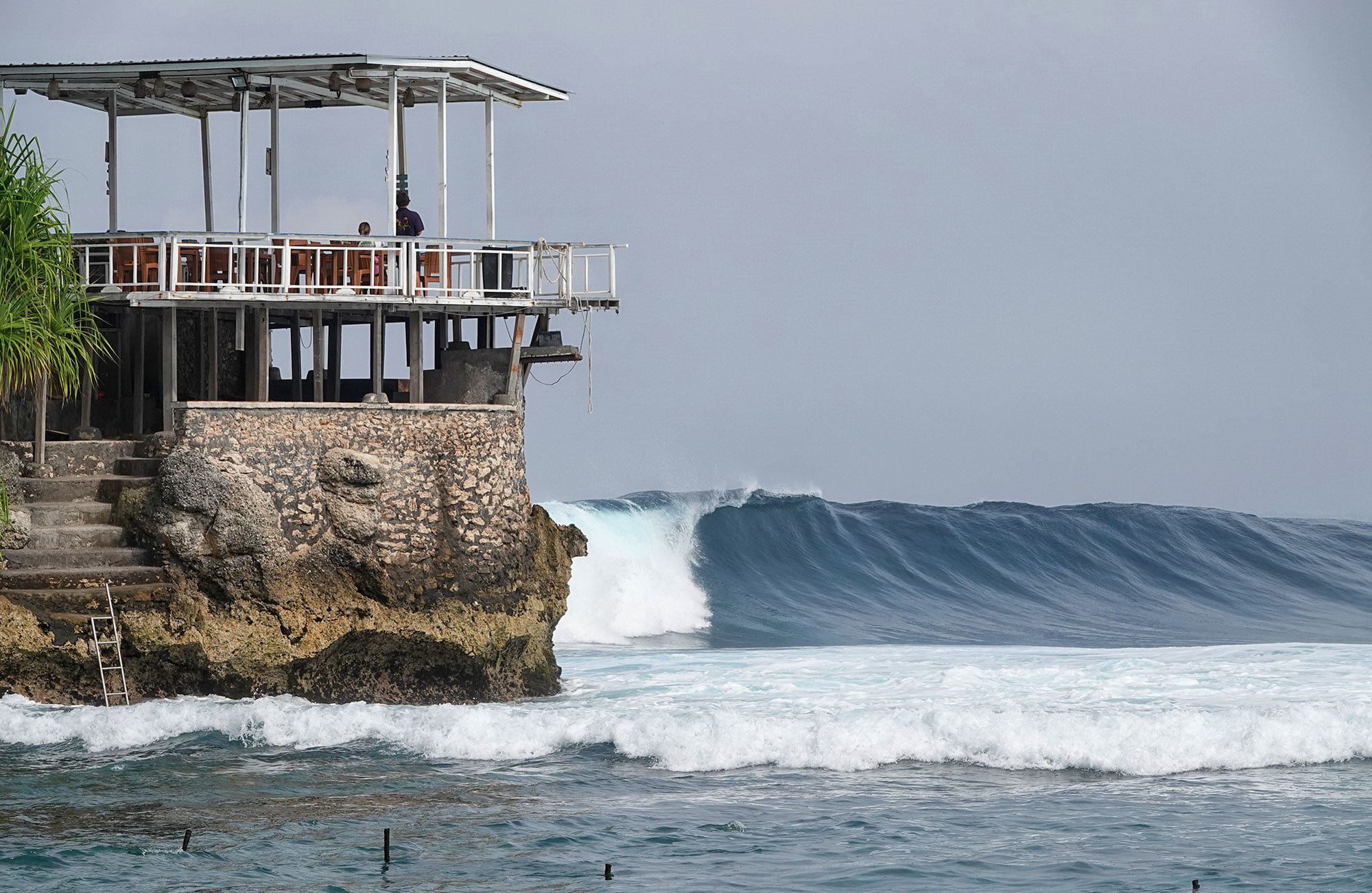 Hidden cliffside restaurant and left hander surf break found on the western tip of Cenningan Island, called Mahana Point.