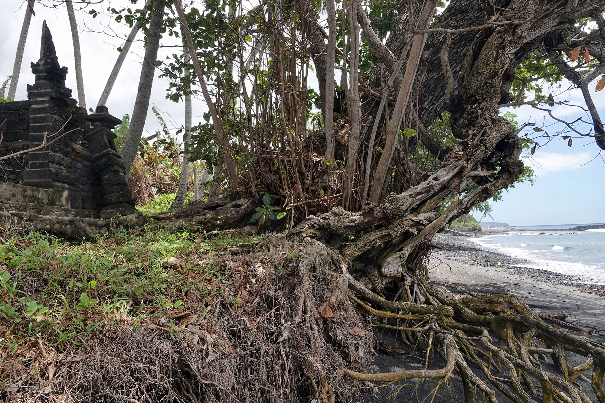 Tree roots lie exposed on the sand by a beach in East Bali.