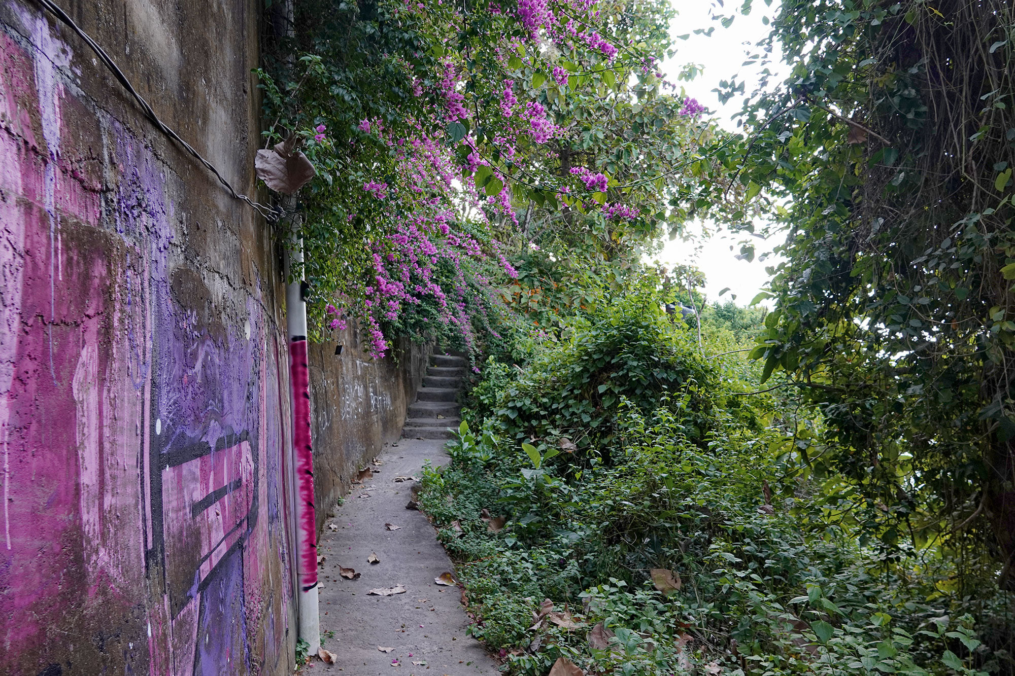 Walking path beside a graffitied wall, forest plants and purple Bougenville flowers.