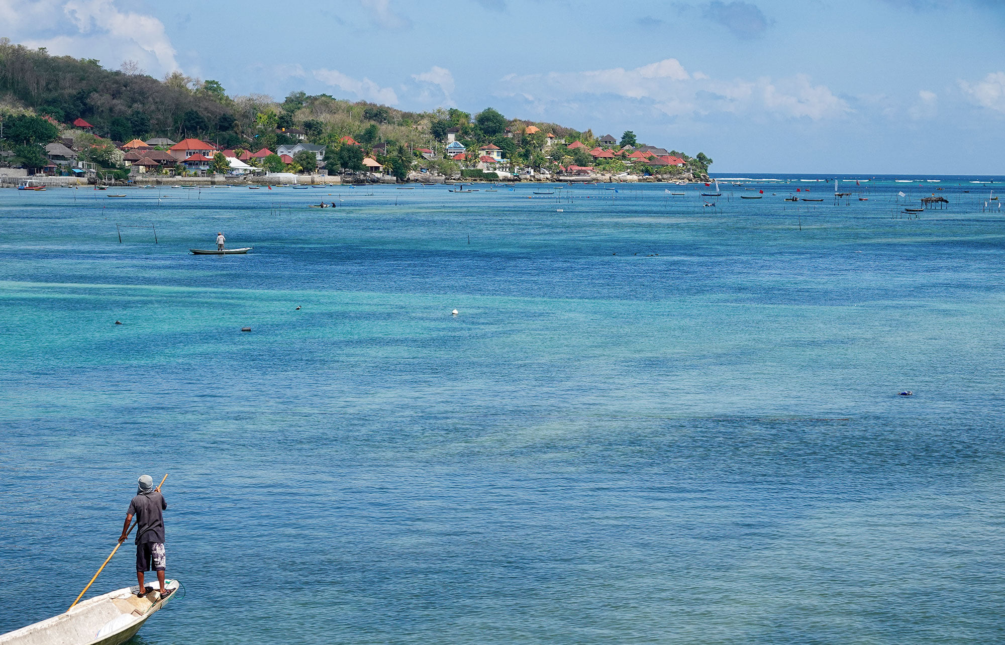 Restaurants line the coast between Lembongan and Ceningan islands, with seaweed farming in between.