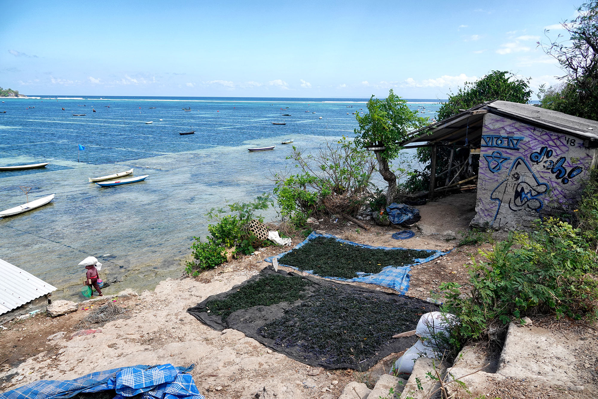 The various views and activities that can be found on the Southern side of Lembongan island, as well as a glimpse into the seaweed farming industry, where some of the farms are located in the shallow channel that separates Nusa Lembongan and Nusa Ceningan.
