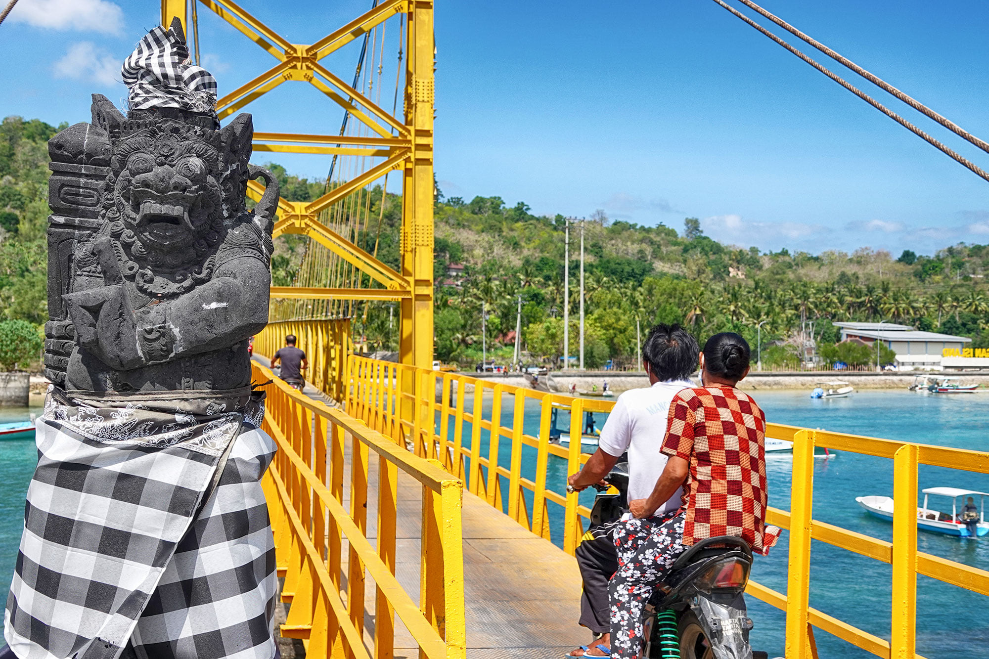 The Yellow bridge connects the islands of Lembongan and Ceningan over a shallow sandy bottom channel.