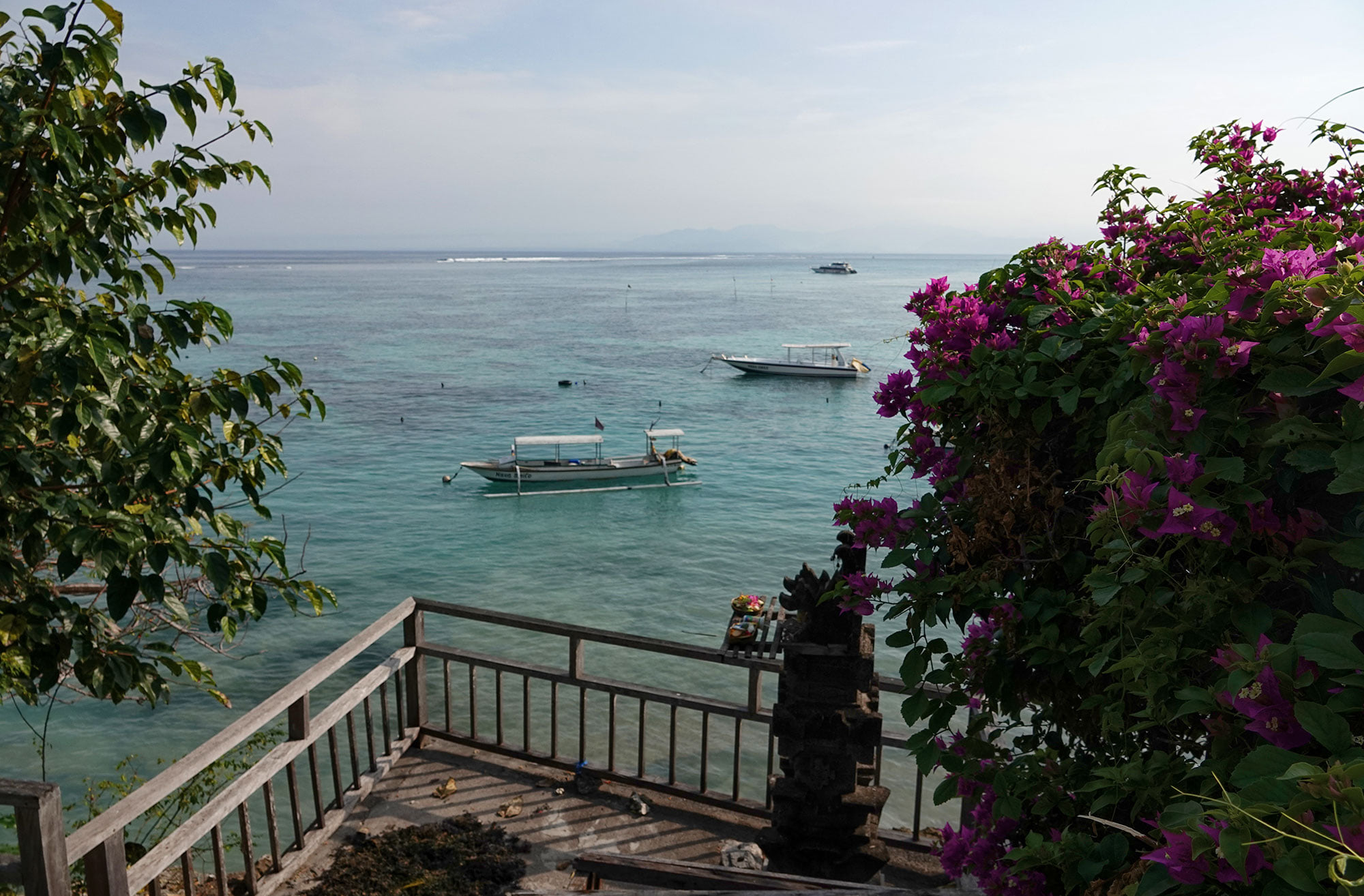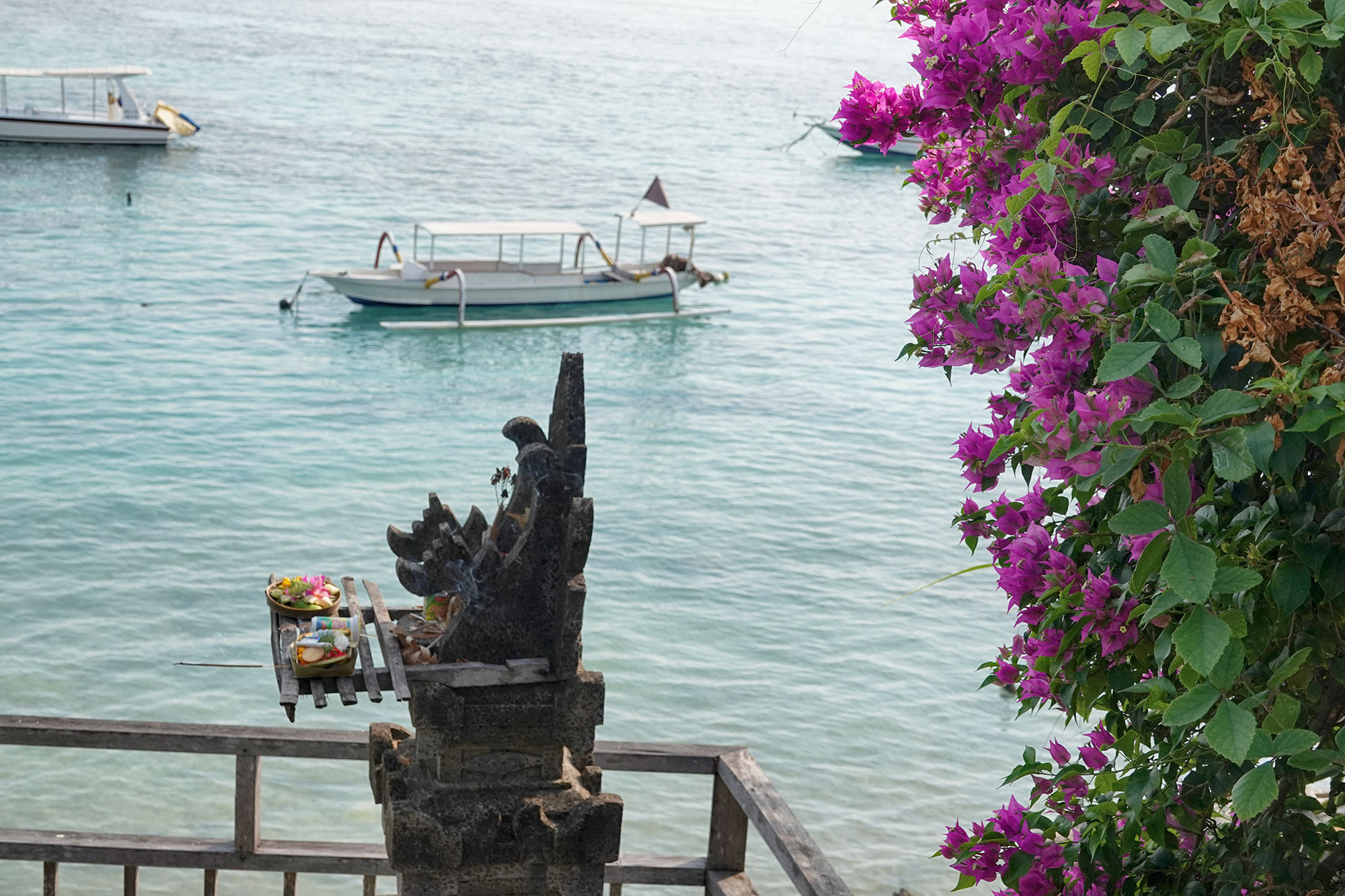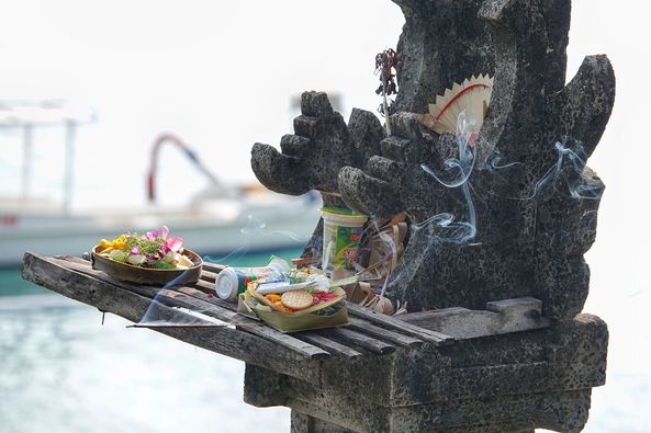 Shots of a small Hindu statue on the hillside of Jungutbatu Village, Nusa Lembongan. This statue holds offerings called Canang that are given with burning incense. It is a rule that each individual property in Bali must hold a statue for offerings, such as this one, which should always be placed on the point of the property closest to Mount Agung.