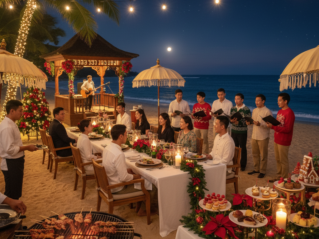 Indulge in a festive seaside dinner with gourmet creations, live BBQ, and decadent desserts.