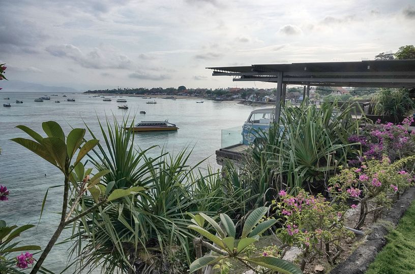 Serene view of Jungutbatu Beach, Lembongan Island in the afternoon, from a hillside restaurant called Thai Pantry that overlooks the bay.