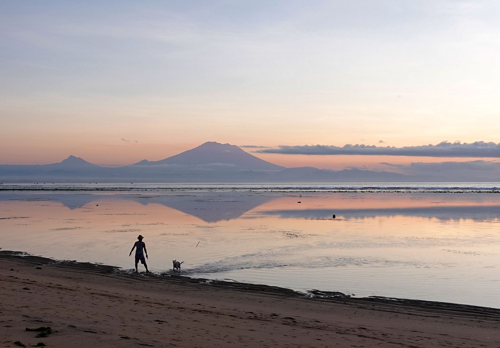A Balinese local walks their dog on Sanur Beach, East Bali at low tide, against a back drop of Mount Agung at sunrise.