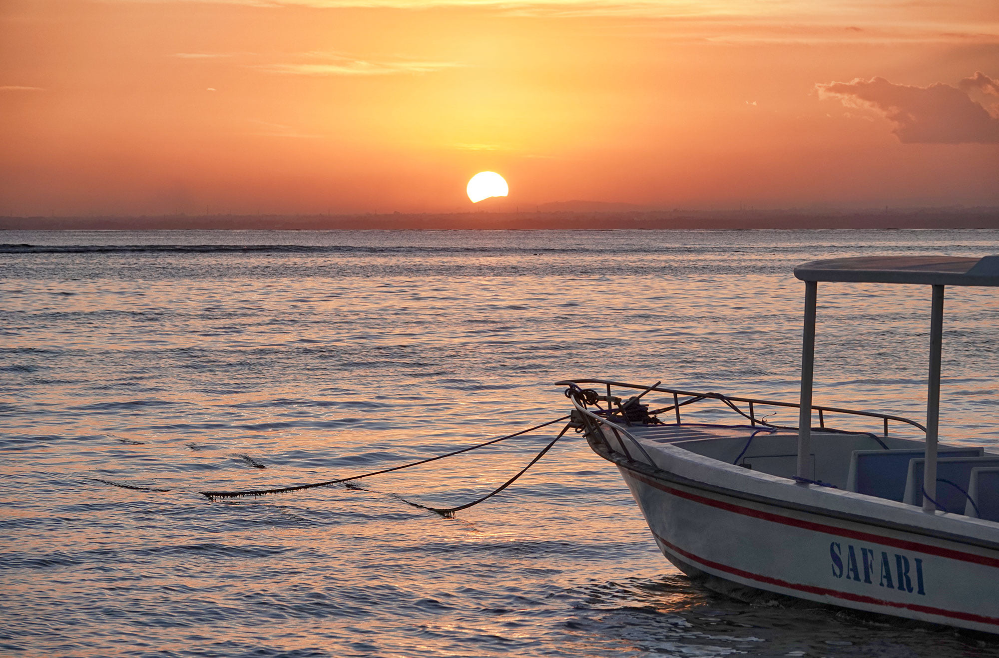 An epic sun sets behind the hills of Bali; seen from behind a boat moored on the beach of Nusa Lembongan, Indonesia.