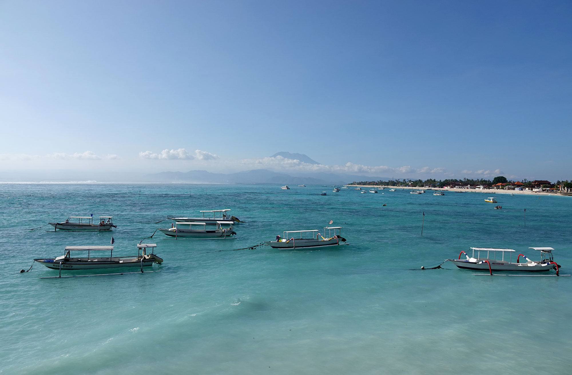 A stunning view of the ocean surrounding Nusa Lembongan on a clear and sunny day.
