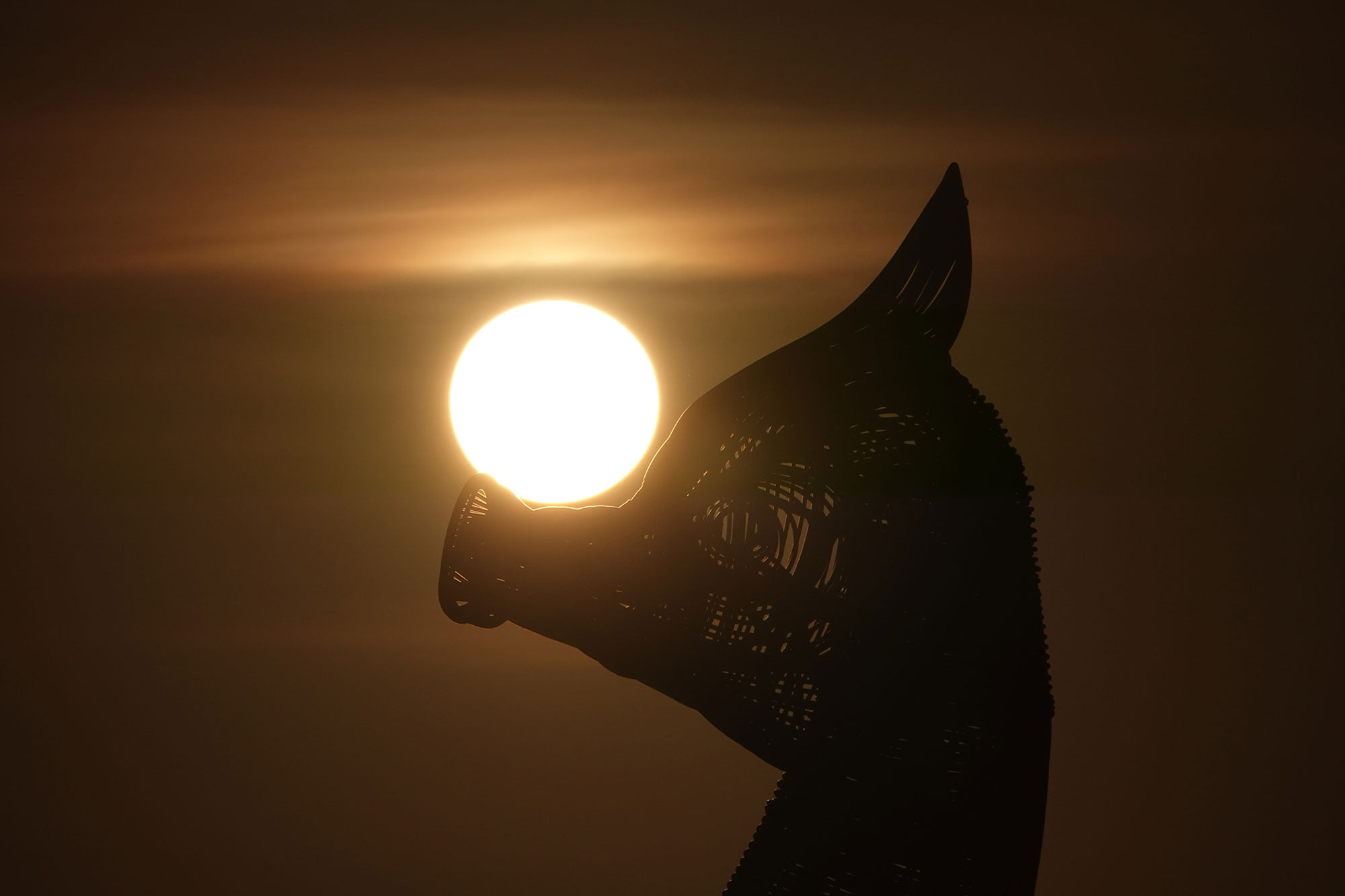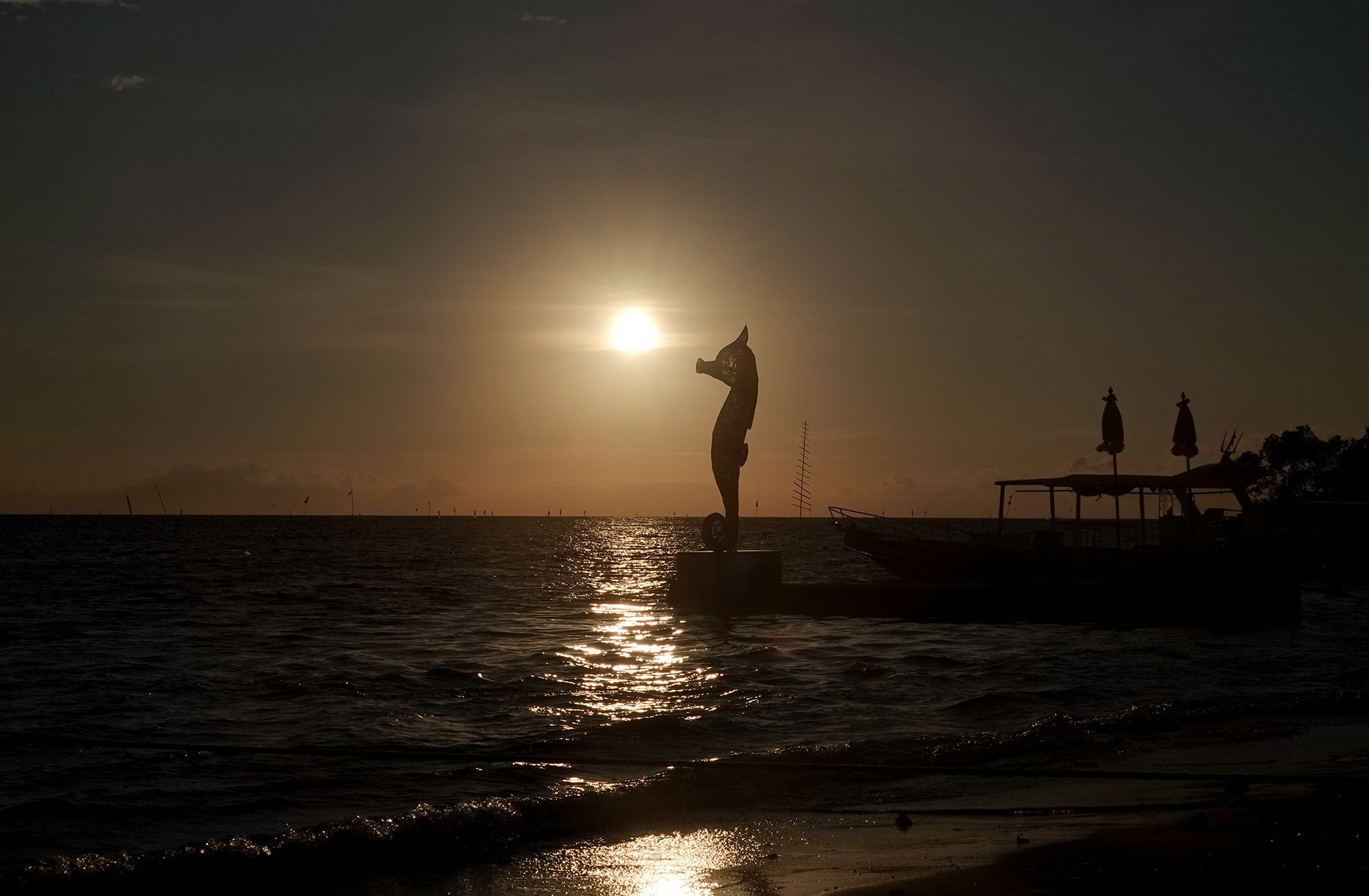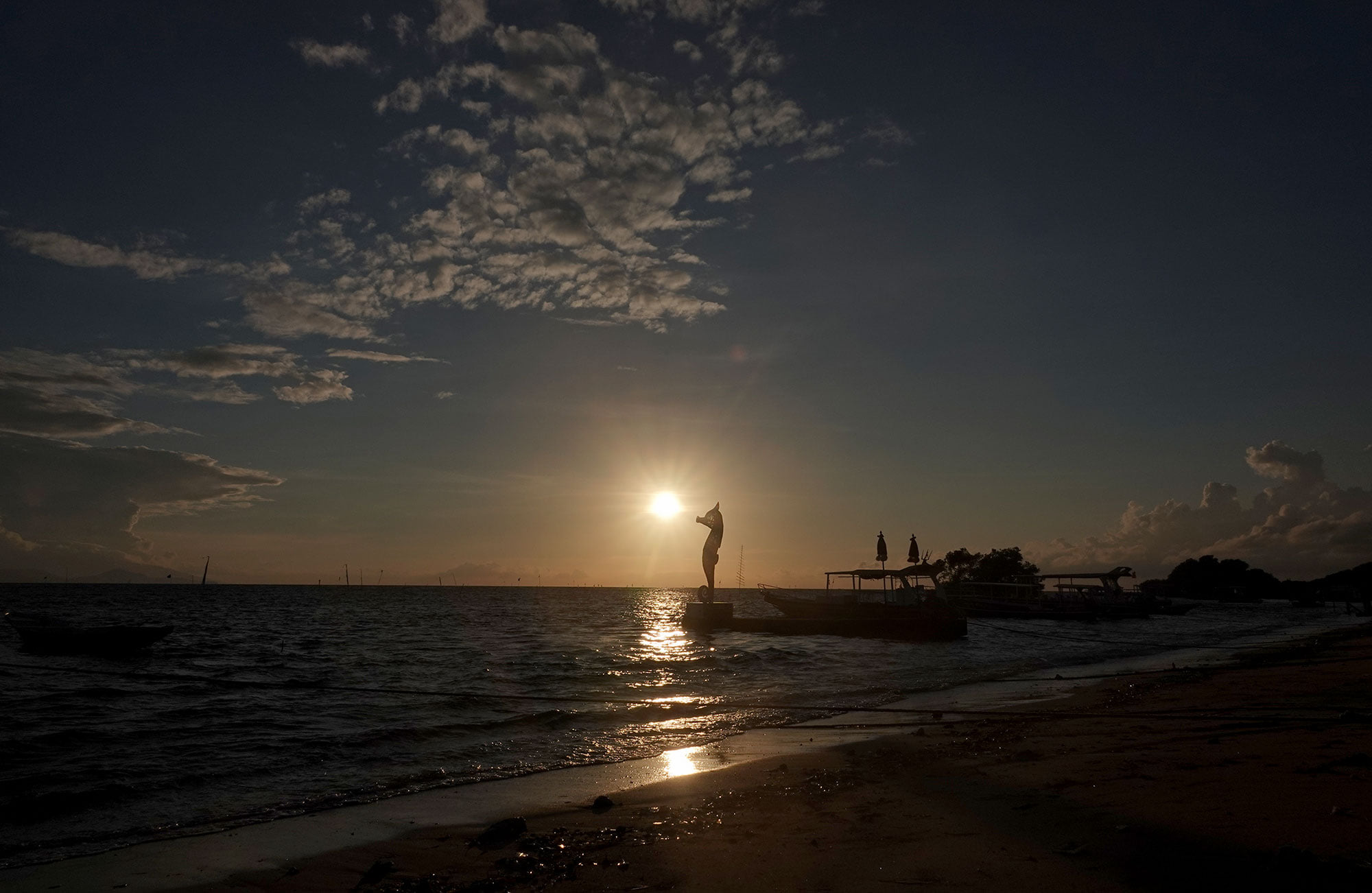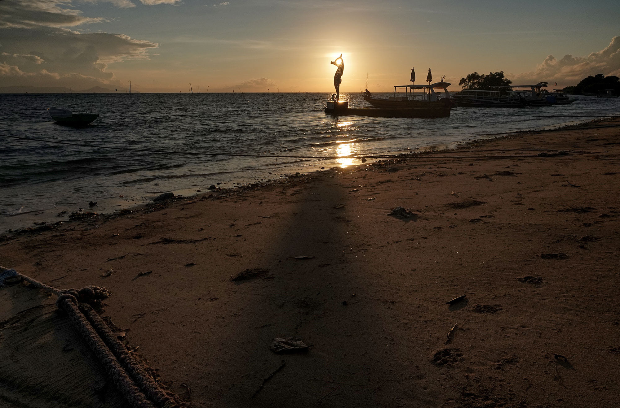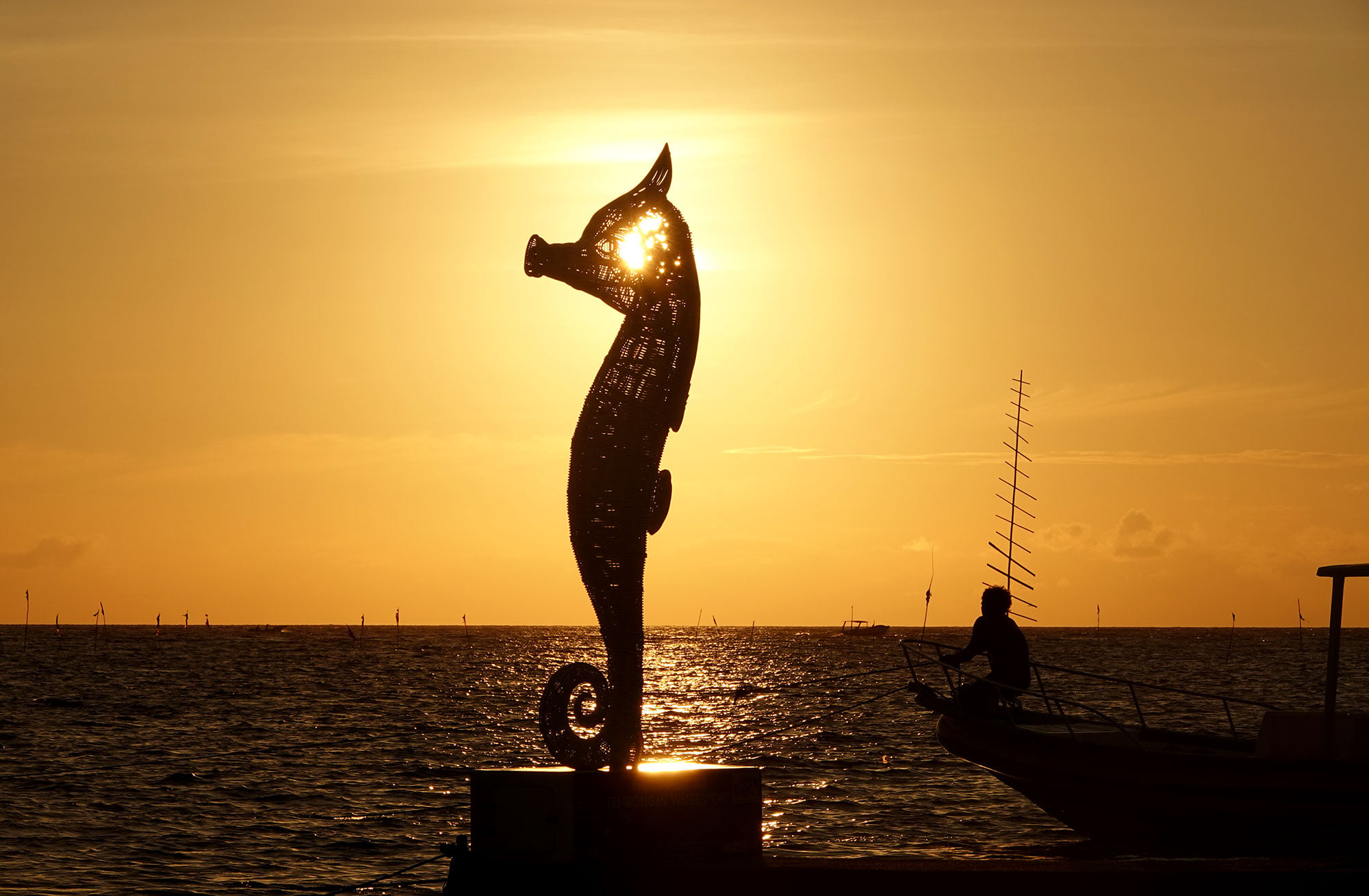 Sunrise penetrating through a statue of a seahorse, beside silhouettes of traditional fishing boats moored along the north side of Nusa Lembongan, Bali, Indonesia.