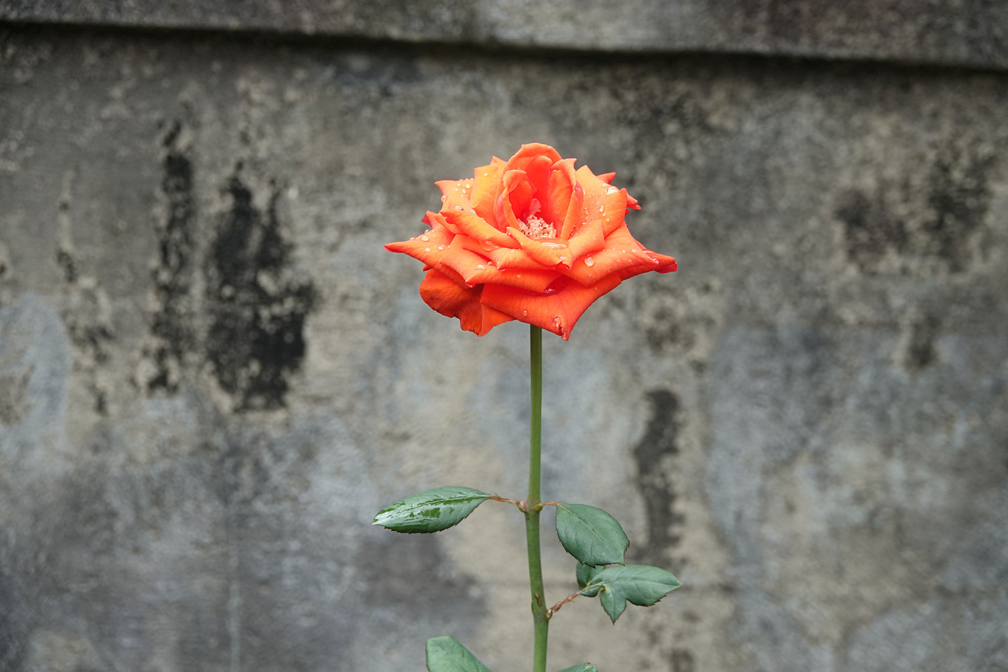 A single rose stands before a backdrop of concrete.