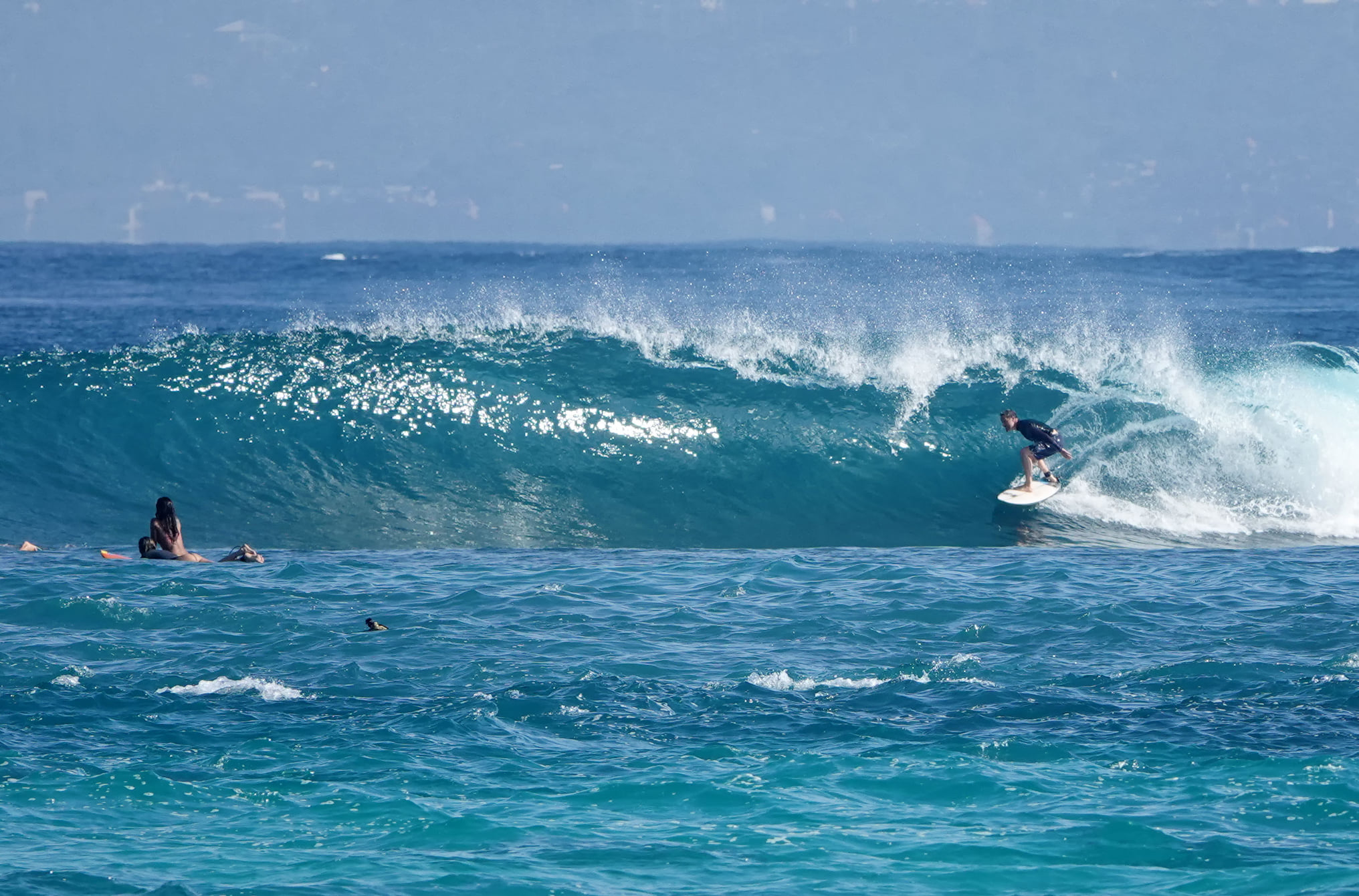 A surfer who tries to make the barrel on the beautiful but fast wave at Shipwrecks break, Nusa Lembongan, while a group of people watch from the water in the channel beside.