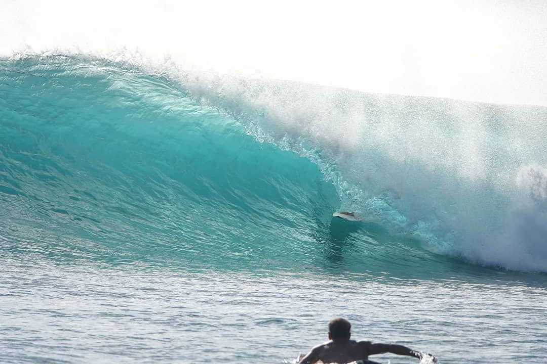 Lembongan surfer Putra Pulu in a barrel at Lacerations surf spot.