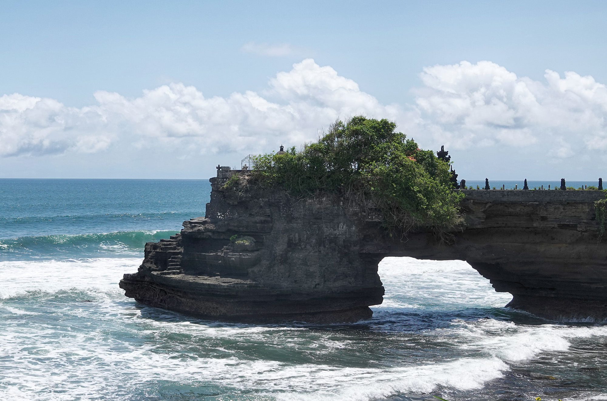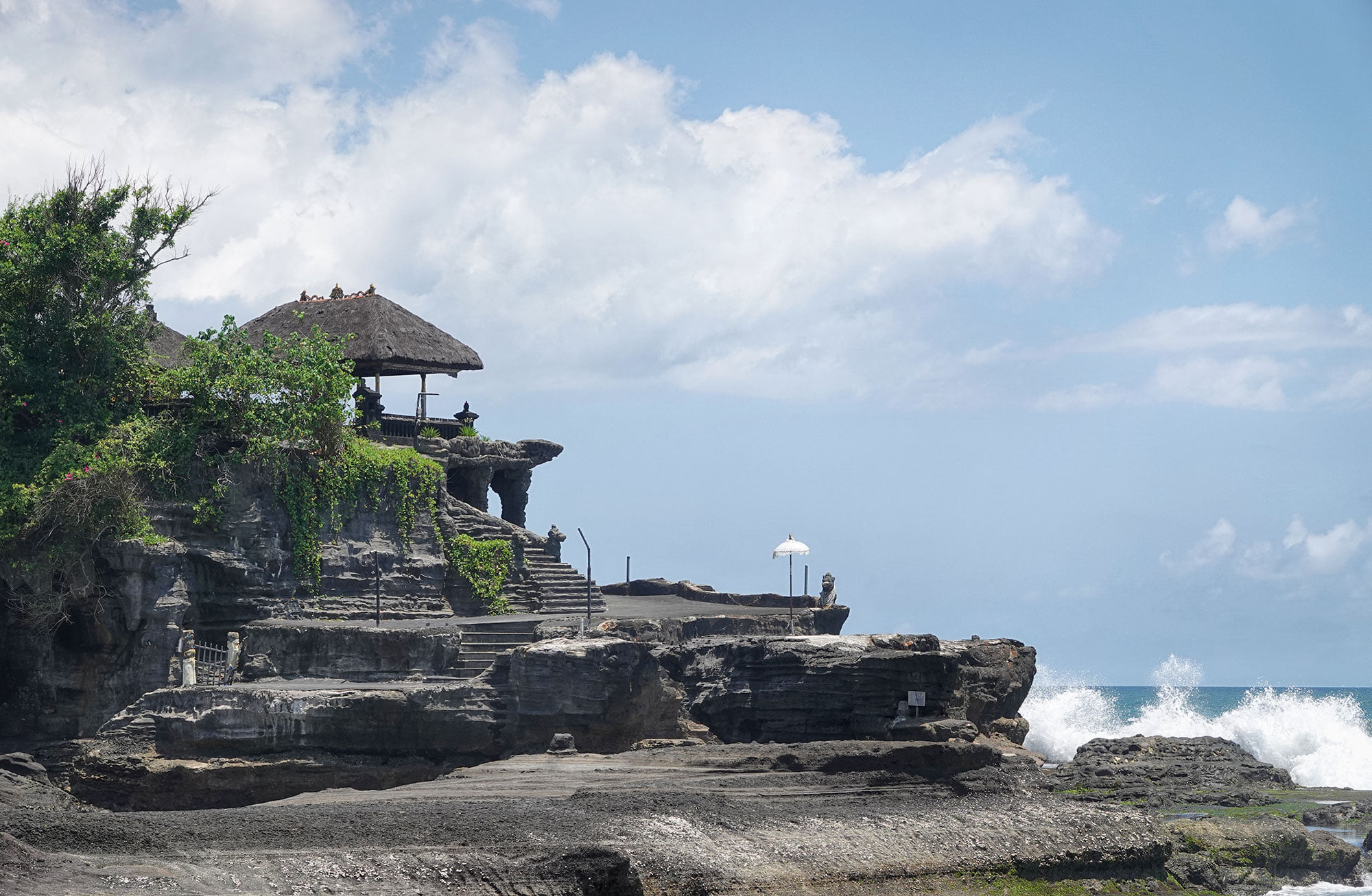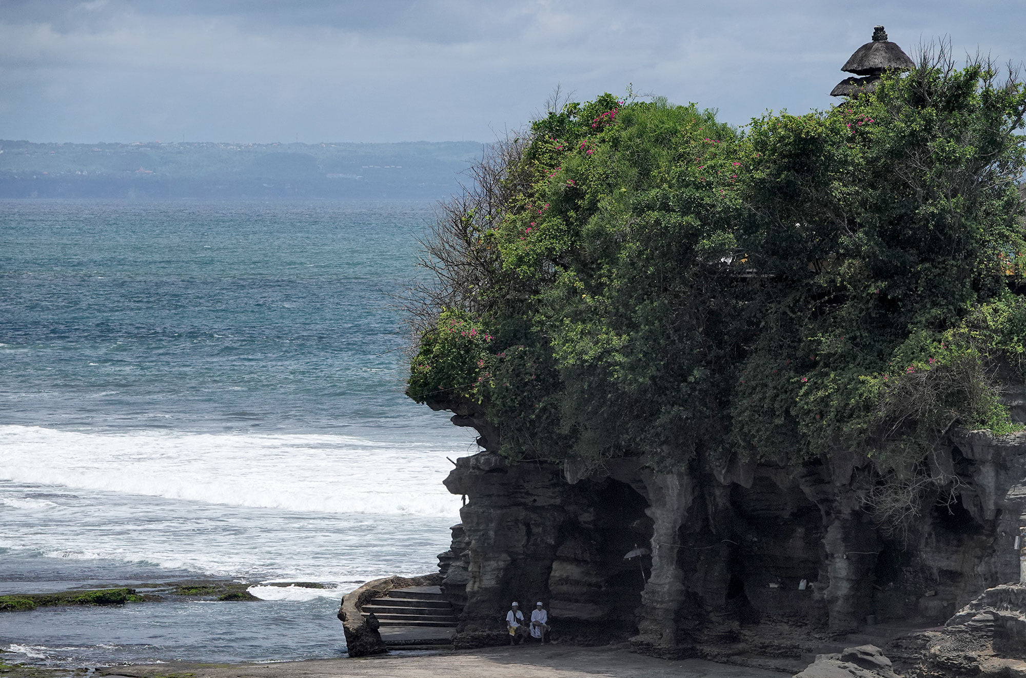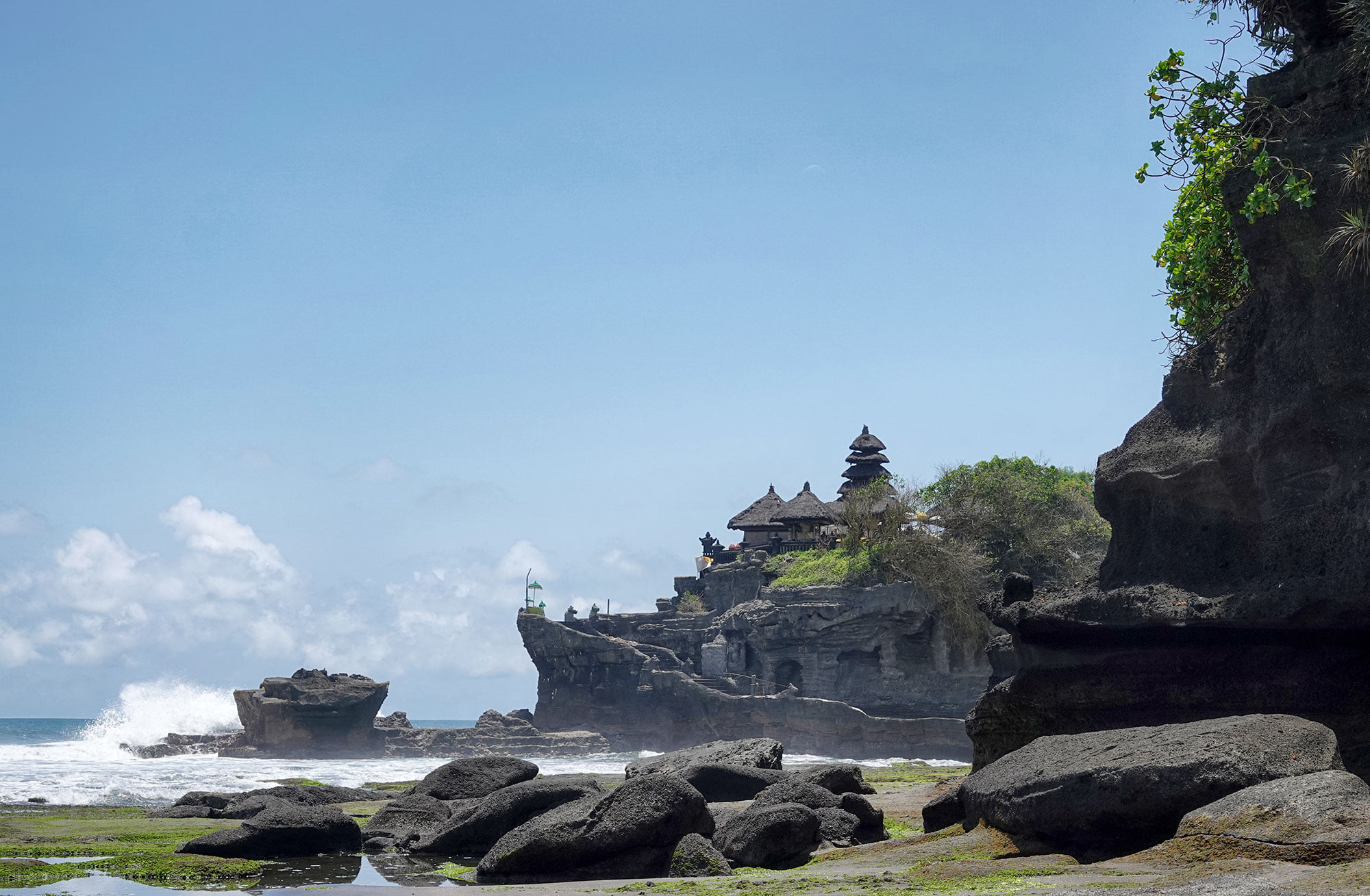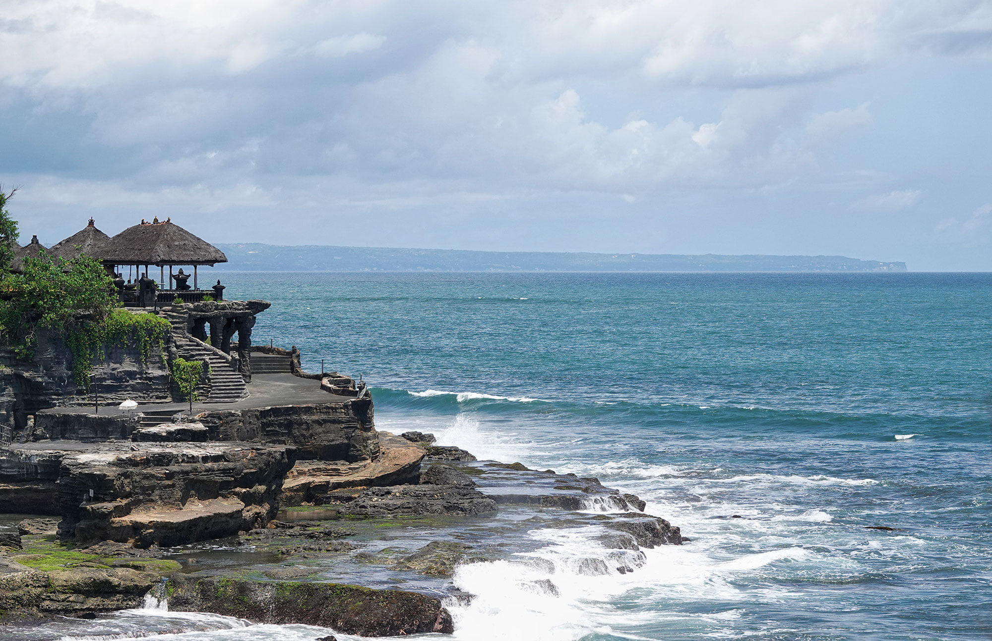 Rolling waves approach the coastline near Tanah Lot Temple.