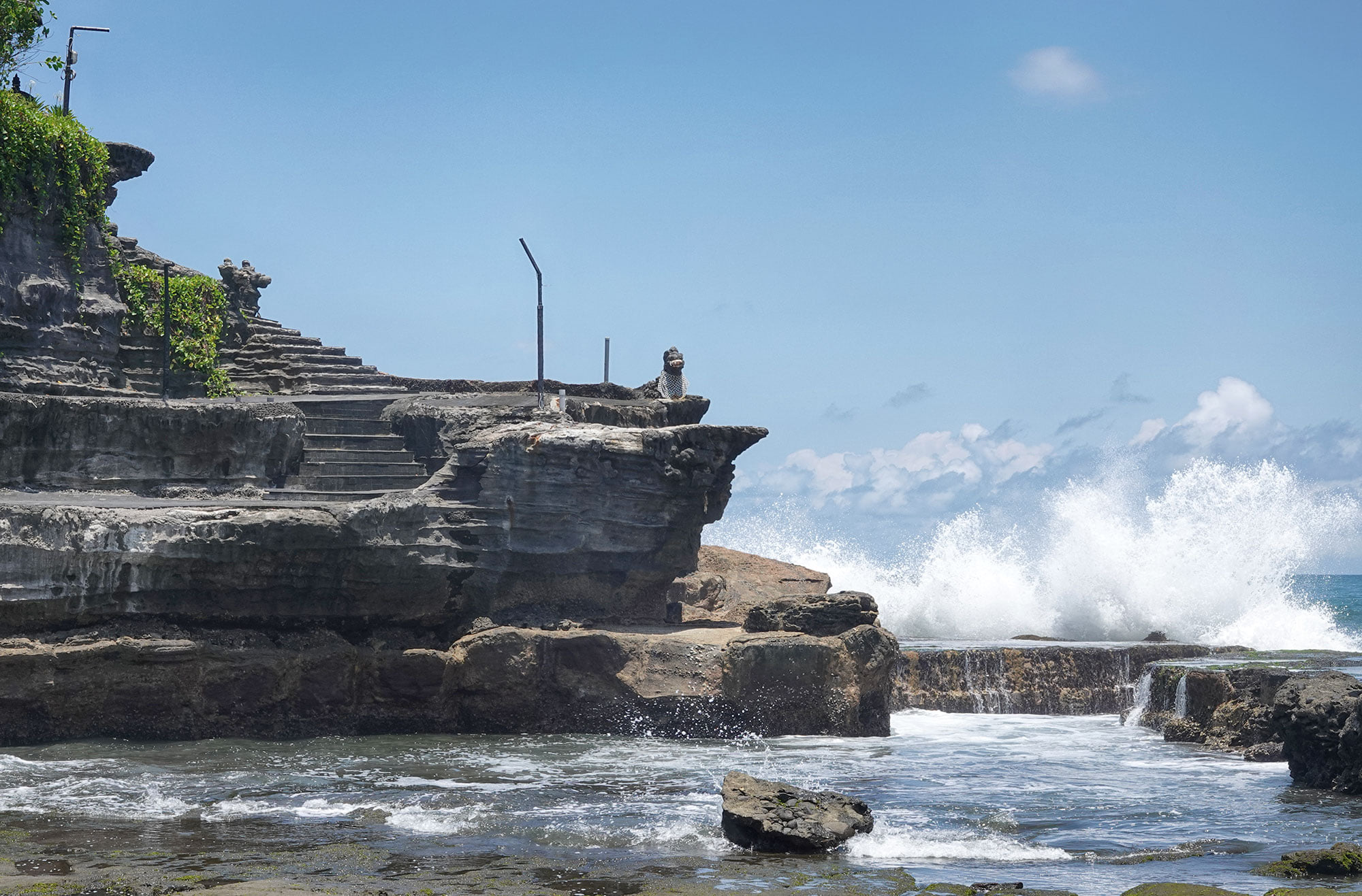 Waves crash powerfully against rocks and cliffs situated below Tanah Lot Temple.