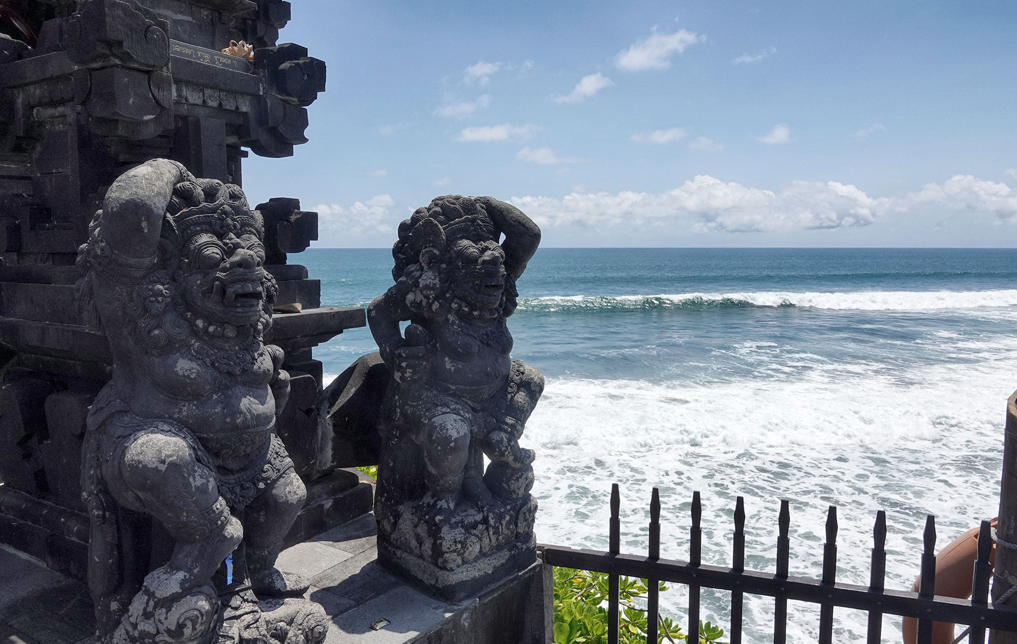 A stone statue from the Hindu Tanah Lot temple looks out over the ocean and towards the West.