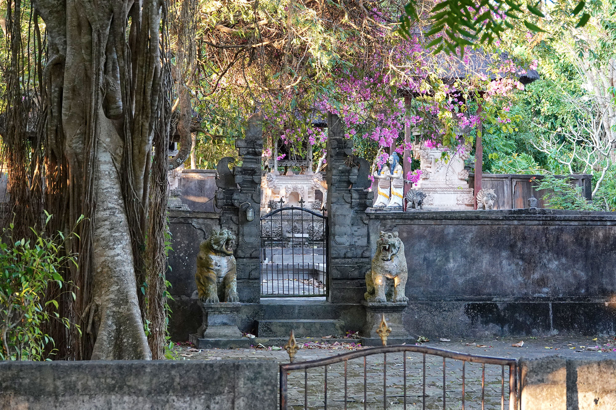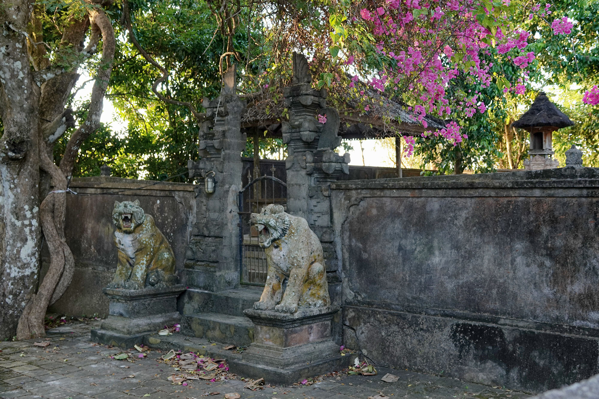 Taking a turn on a public road towards the cliffs above Padang Padang Beach, one can happen across this small and awesome temple. The entrance to which is guarded by Hindu tiger statues and decorated with purple Bougenville flowers.