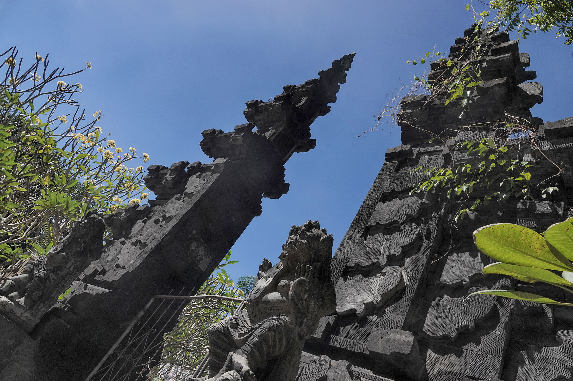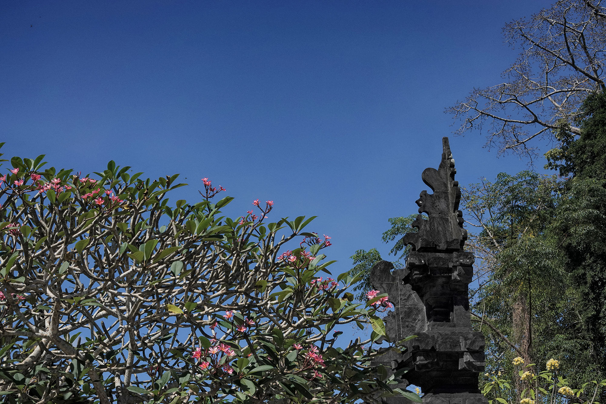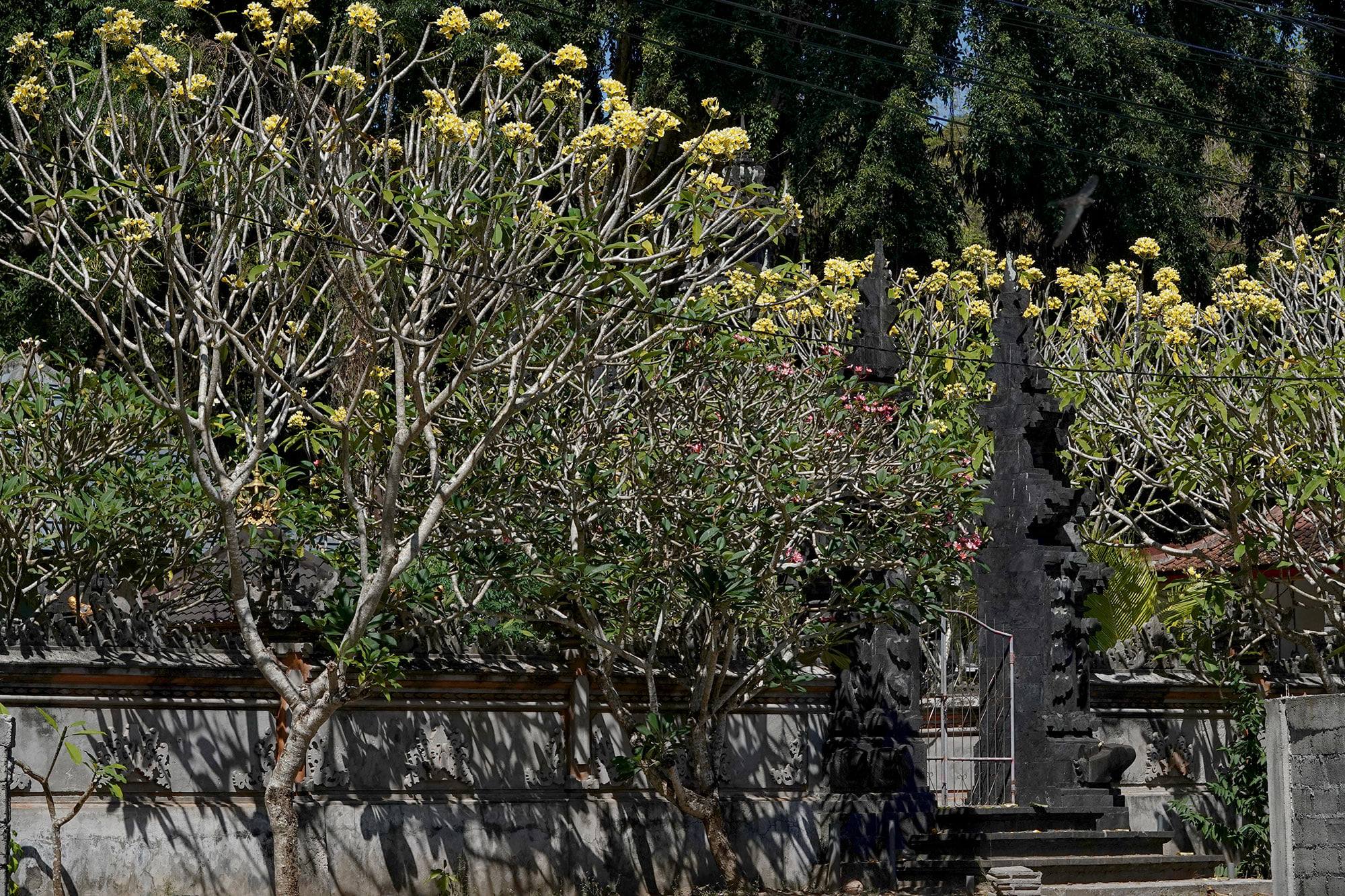 Beautiful and vibrant yellow and pink Frangipani flowers grow in abundance surrounding an entrance to a Balinese temple.